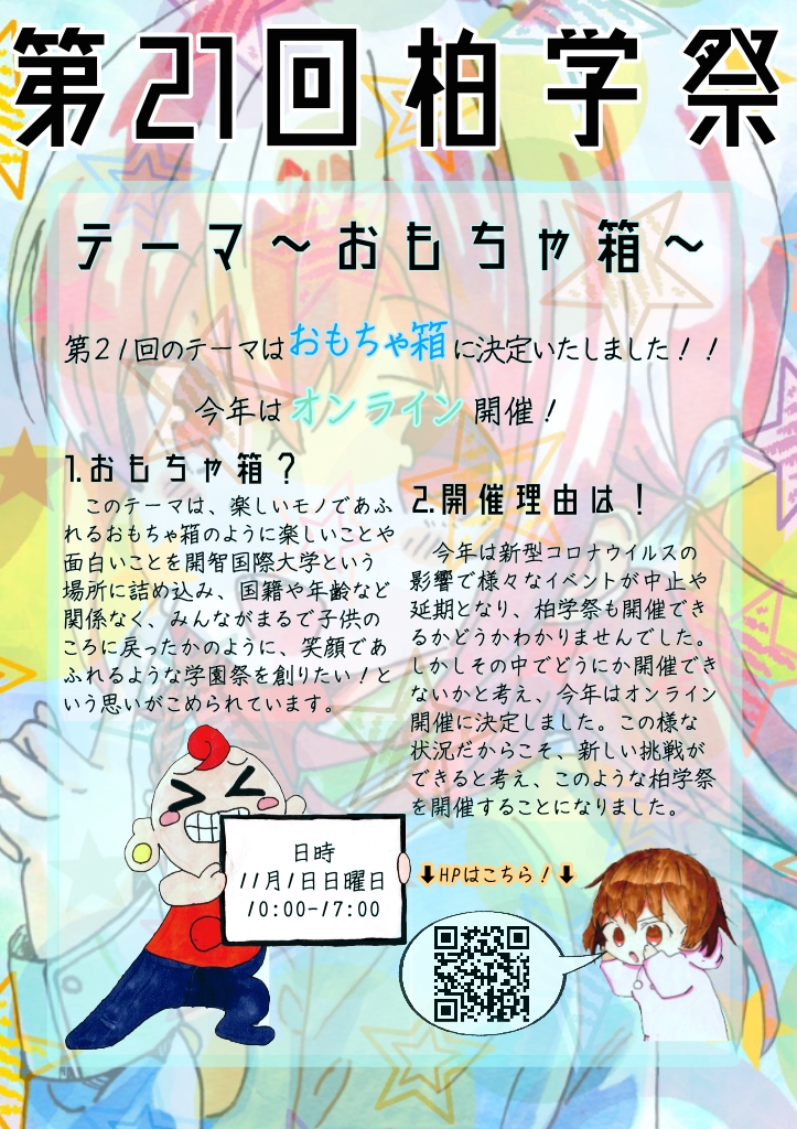 このテーマは、楽しいモノであふれるおもちゃ箱のように楽しいことや面白いことを開智国際大学という場所に詰め込み、国籍や年齢など関係なく、みんながまるで子供のころに戻ったかのように、笑顔であふれるような学園祭を創りたい!という思いがこめられています。